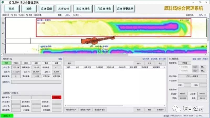 镭目智能堆取料机管理系统是国内首家将3D扫描技术成功应用于钢厂原料场散料转运行业的智能系统。该项目通过三维坐标转换技术,料堆三维仿真技术,自适应轨迹算法等先进技术,实现堆取料机远程操作以及无人化,让原料入场、出场、配煤配矿自动化、皮带路径自动选择,堆取料机无人驾驶、料场实际数据实时动态精细化管理,实现铁前原料场智能化管理。