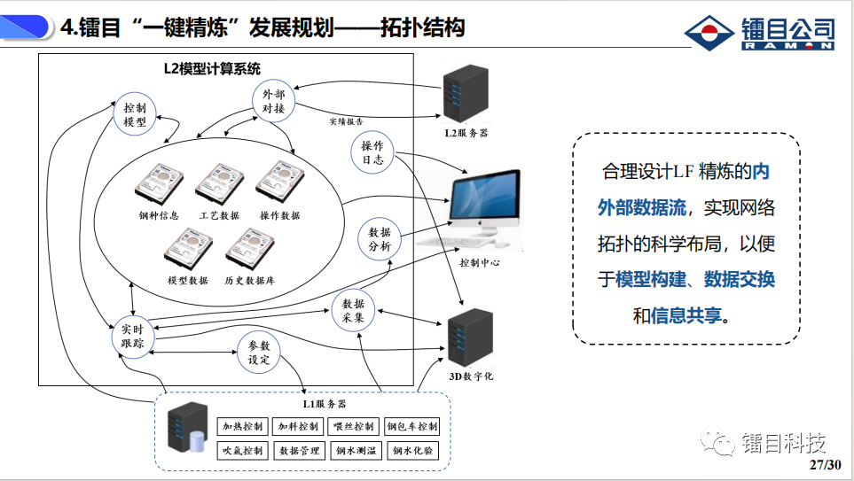 ▲镭目“一键精炼”发展规划——数据平台、大数据集成与应用、网络通讯架构、拓扑结构