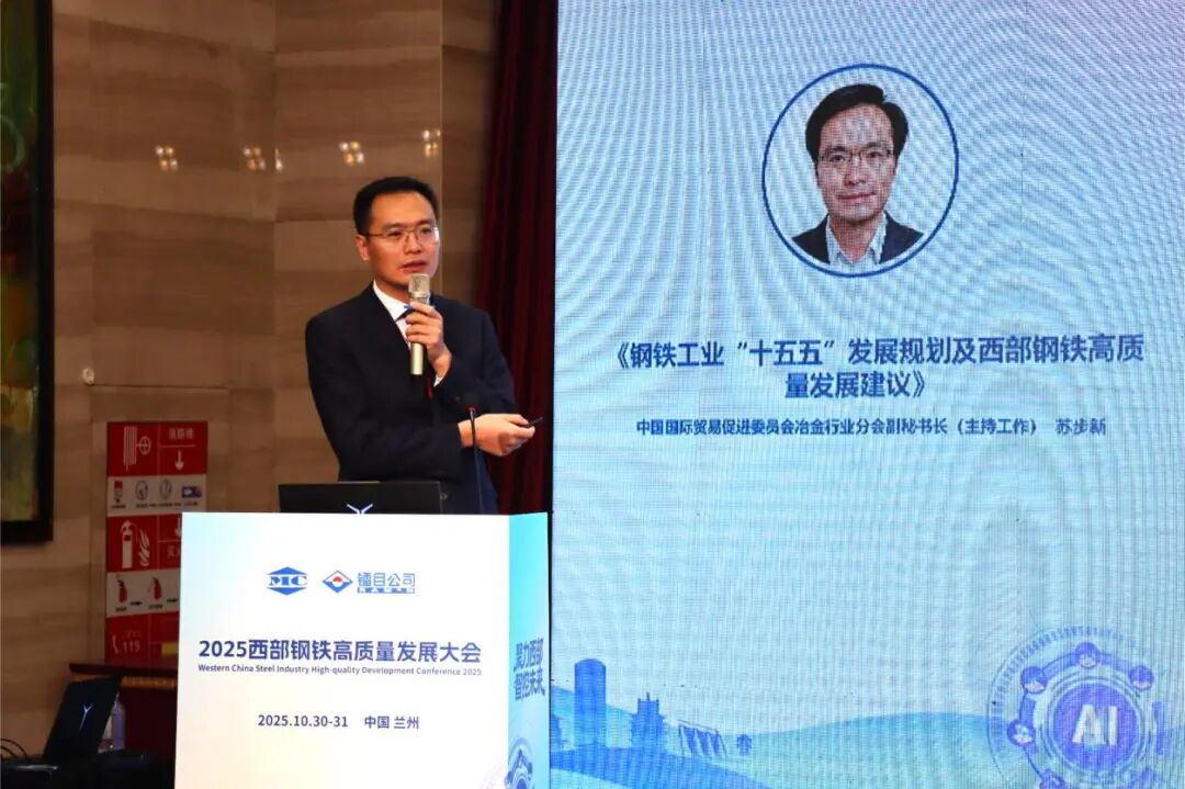 在主题报告环节,冶金贸促会副秘书长(主持工作)苏步新以《钢铁工业“十五五”发展规划及西部钢铁高质量发展建议》为题展开深度分析。他表示,西北钢企建材占比近 2/3,附加值低且依赖房地产、基建投资,抗周期能力弱;西部钢企绝不能再走规模扩张老路,需借 “一带一路” 与高质量发展机遇,从 “普通钢材生产商” 转型为服务国家战略与区域经济的 “高端专业化材料服务商”。